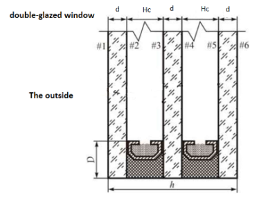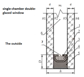 1 — glass; 2 — spacer; 3 – desiccant silica gel; 4 – primary sealant; 5 — secondary sealant; 6 – air chamber; 7 – dehydration holes; d – glass thickness; h – double-glazed units thickness; Hc – distance between panes; D – sealing depth; #1-#6 – numbering of glass surfaces in the design of double-glazed units