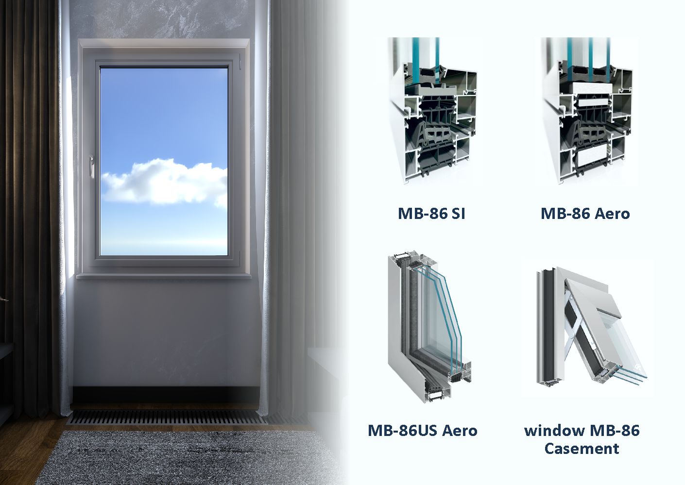 The highly efficient MB-86N window and door system makes it possible to satisfy the diverse needs of users. There are two versions of the profiles, the ST and the SI, which are designed to meet different thermal energy efficiency requirements. The system provides superb performance parameters. Another advantage of the MB-86N is the high durability of the profiles, which make it possible to produce large-scale and heavy structures. Several versions are available. The MB-86US is a window with a concealed vent. The MB-86 Casement provides an outward-opening window with a thermal break. The MB-86B has been developed to meet the requirements of the Belgian market.