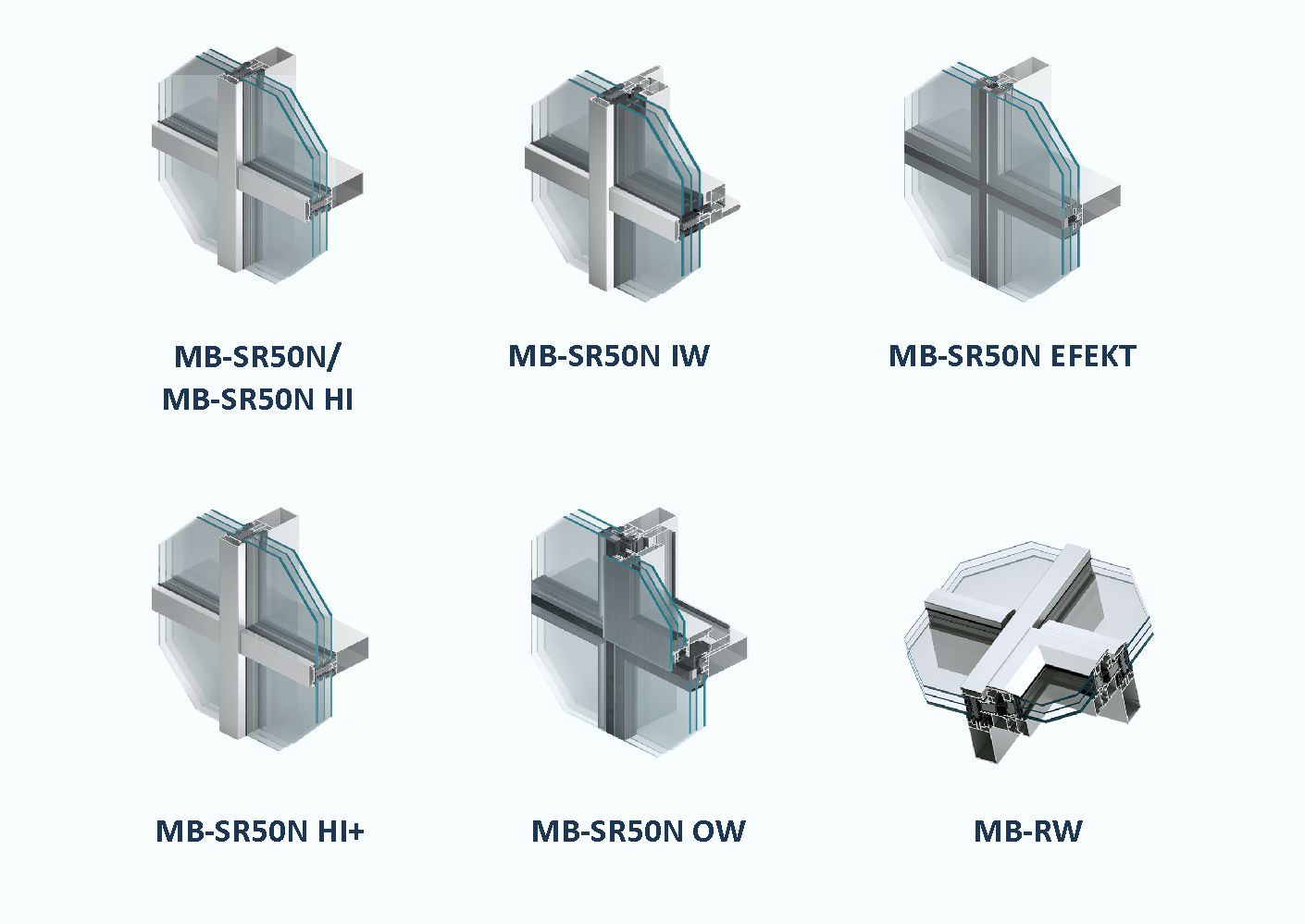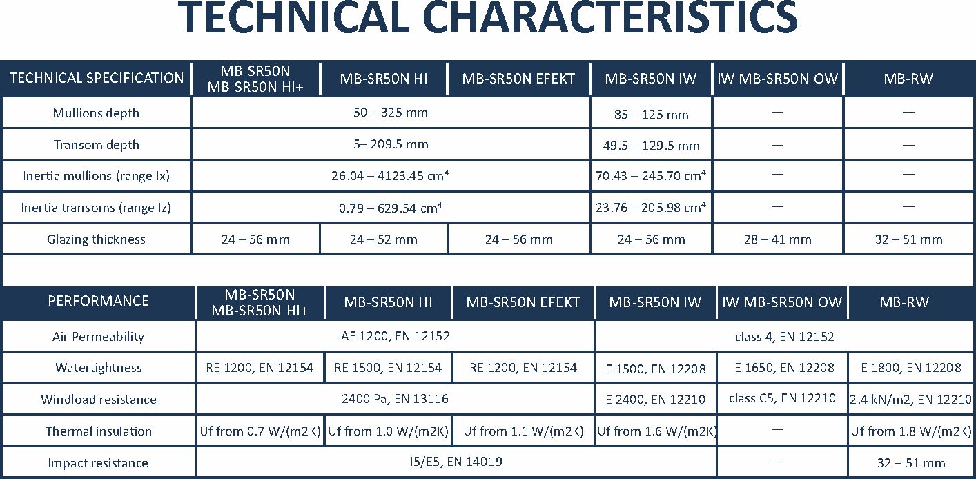 The MB-SR50N mullion-transom system has been designed to fabricate lightweight curtain walling, roofs, skylights and other spatial structures. On current trends in architecture, it allows aligning of mullion and transom profiles on the inner side of the façade, so obtaining variants of different appearance.